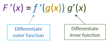 Differentiate the outer function first, then multiply by the derivative of the inner function.