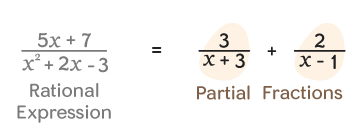 \( \dfrac{5x+1}{(x+1)(x+2)} = \dfrac{A}{x+1} + \dfrac{B}{x+2} \)