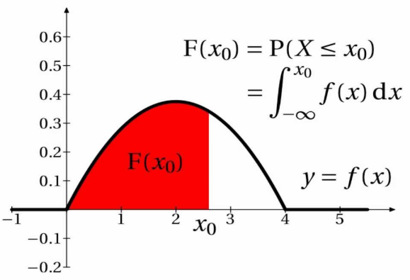 \( \mathrm{F}(x_0) = \mathrm{P}(X \leq x_0) = \displaystyle \int_{-\infty}^{x_0} f(x)\,\mathrm{d}x \)