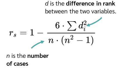 \( \mathrm{r_s = 1 – \dfrac{6\sum d^2}{n(n^2 – 1)}} \)