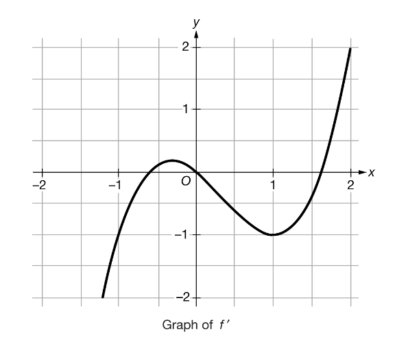 The slope of the line tangent to the graph of f at x=1is given by f′(1). From the graph, f′(1)=−1. Because f(1)=−2, the tangent line passes through the point (1,−2).