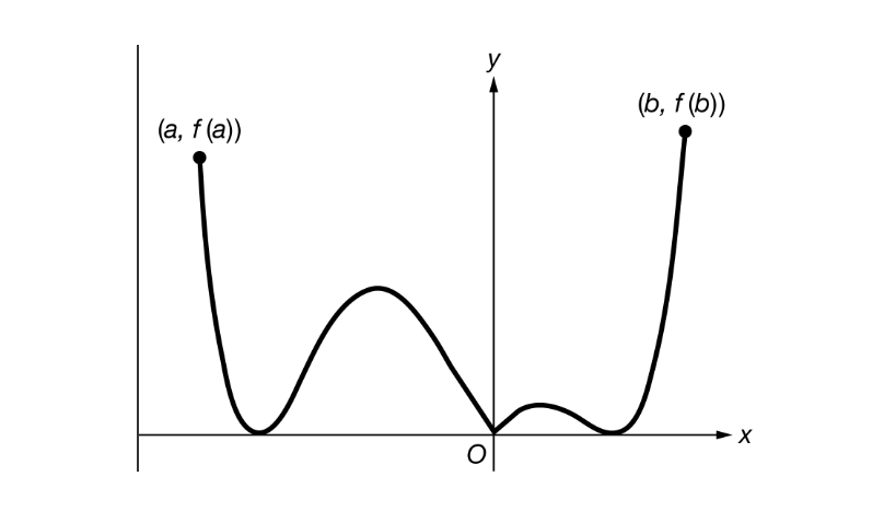 The expression \(\frac{f(b)-f(a)}{b-a}\) is the average rate of change of over the interval a≤x≤b and is equal to the slope of the secant line passing through the points (a,f(a)) and (b,f(b)). The expression is the instantaneous rate of change of at x=c and is equal to the slope of the line tangent to the graph of f at x=. There are four points on the graph of at which the slope of the tangent line is equal to the slope of the secant line. Two of the points occur to the left of the -axis, and two of the points occur to the right of the -axis.