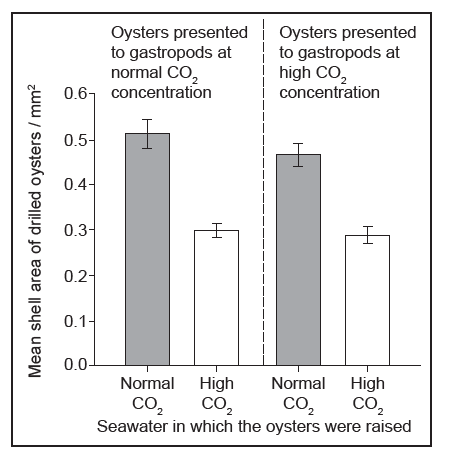 Equal numbers of oysters raised in seawater with a normal CO2 concentration and in seawater with a high CO2 concentration were then presented together to the gastropod predators in seawater with a normal CO2 concentration. The same numbers of oysters from the two groups were also presented together to the gastropods in seawater with a high CO2 concentration. The bar charts show how many of the oysters were drilled by the gastropods and the mean size of drilled oysters.