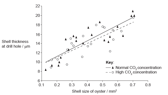 a. the data/trend lines indicate that a higher CO2 concentration diminishes the shell thickness, making gastropod predation more successful