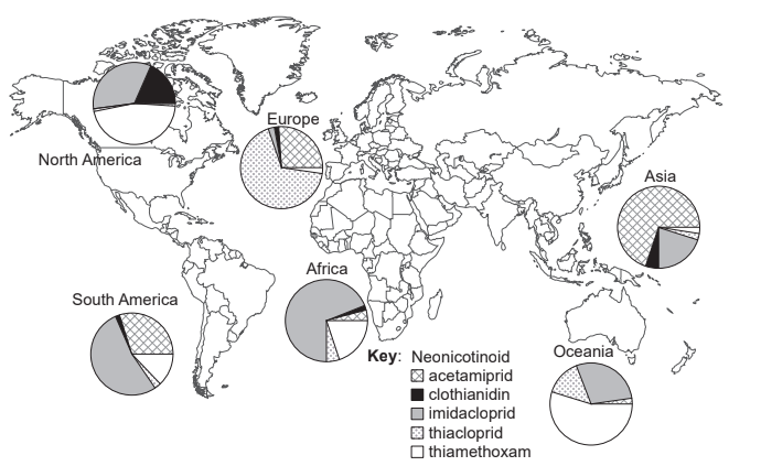 Scientists measured the concentration of five neonicotinoids (acetamiprid, clothianidin, imidacloprid, thiacloprid and thiamethoxam) in honey samples from 198 different locations across the world. Each pie chart shows the relative frequency of neonicotinoids in honey samples from a continent.