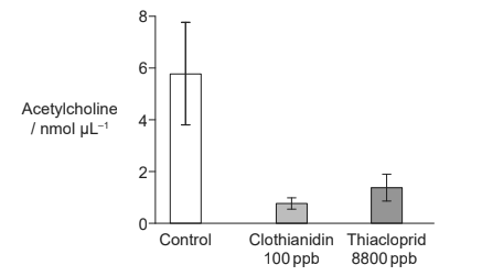 The concentration of acetylcholine was measured in royal jelly produced by honeybees that had never been exposed to neonicotinoids (control) and honeybees that had been exposed for three weeks to two neonicotinoids; clothianidin and thiacloprid.