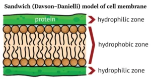 The Davson–Danielli model of membrane structure proposed that membranes were composed of a phospholipid bilayer that lies between two layers of globular proteins, as shown in this diagram.