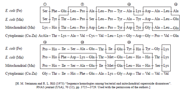 The following shows part of the amino acid sequences of these enzymes. Boxes enclose identical amino acids in the sequence of the two E. coli and mitochondrial dismutases.