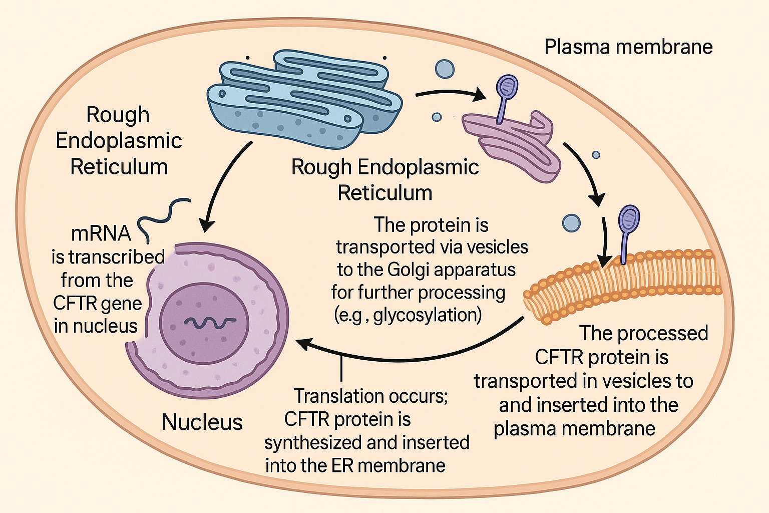 Because CFTR is a membrane protein, it is synthesized on ribosomes bound to the rough ER.