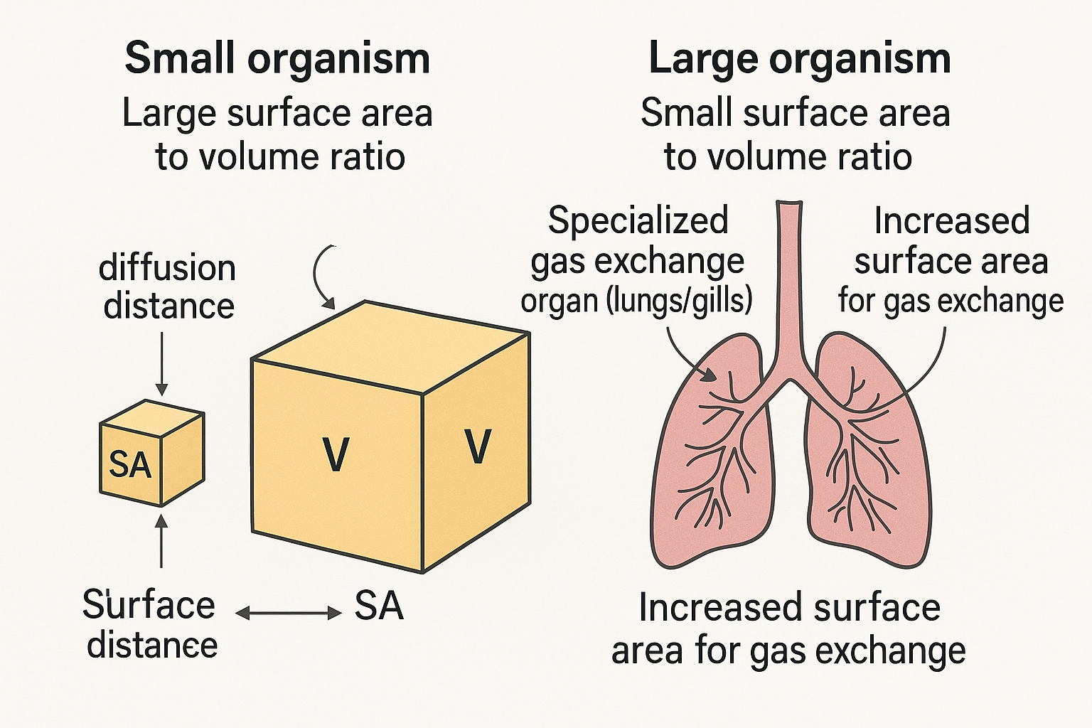Large organisms cannot rely on simple diffusion through the body surface because their surface area is too small relative to their large volume. Diffusion distances to internal tissues are long, so specialized gas exchange organs (like lungs or gills) are needed to greatly increase surface area and maintain rapid gas exchange.Evaluation of options: