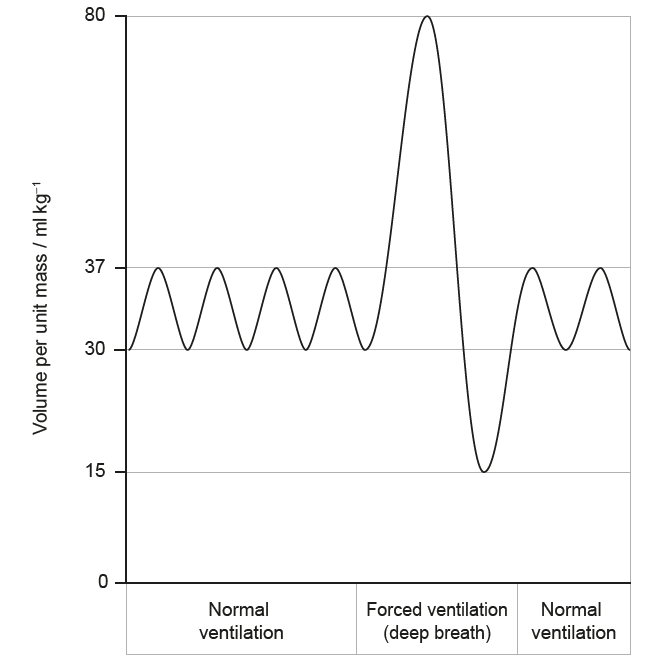 The graph below illustrates how lung volume changes during both normal breathing and forced ventilation (deep inhalation and exhalation).