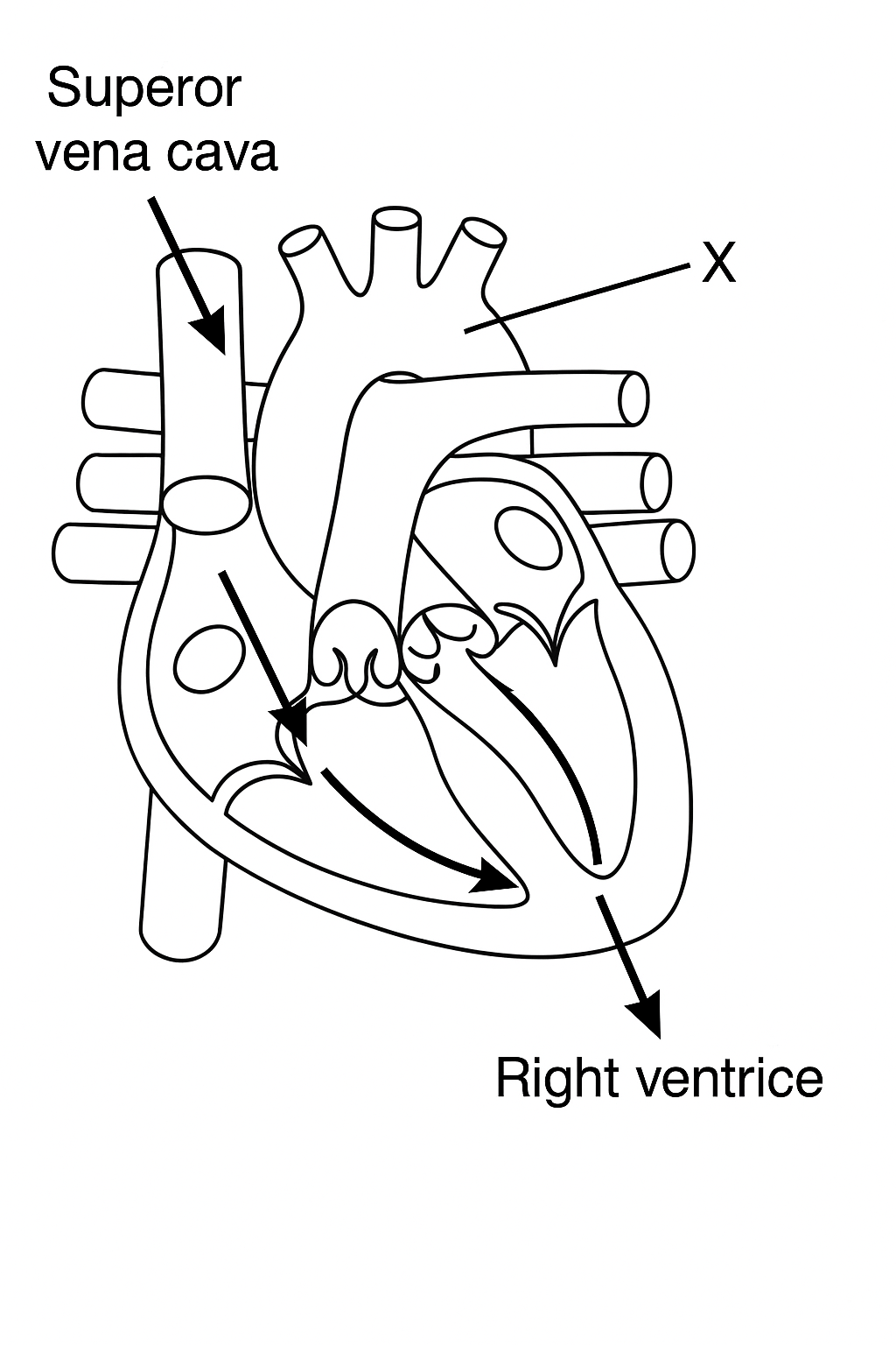 (a) Arrows added to the diagram to show how deoxygenated blood enters the heart:
