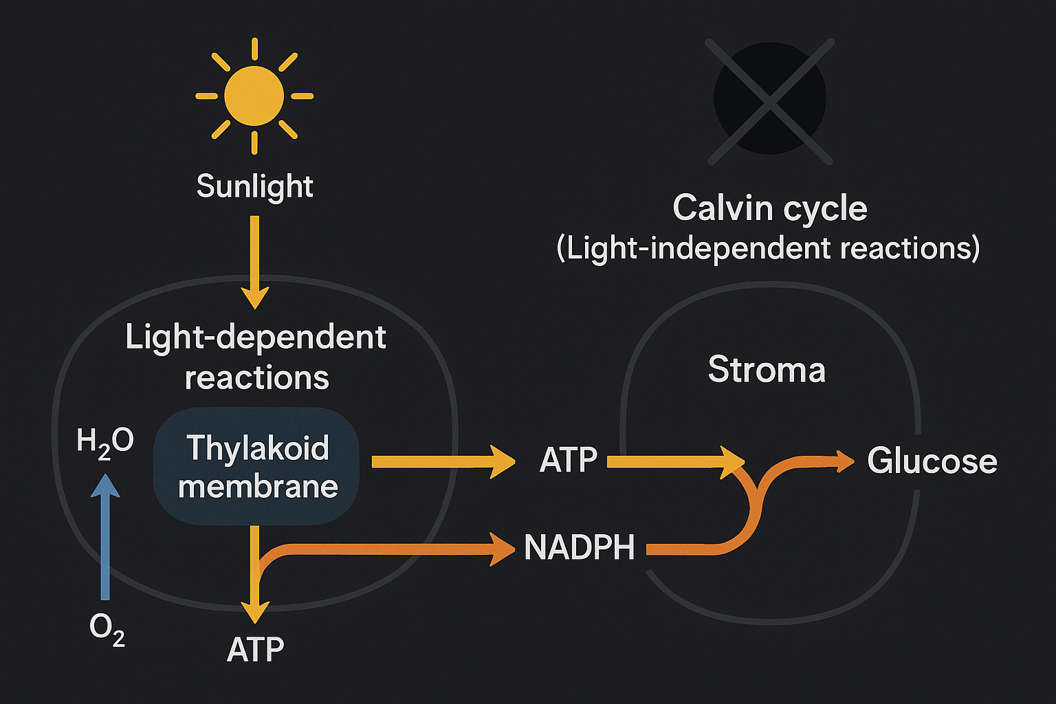 - Light-independent reactions (Calvin cycle) – use ATP and NADPH to convert \(CO_2\) into glucose.