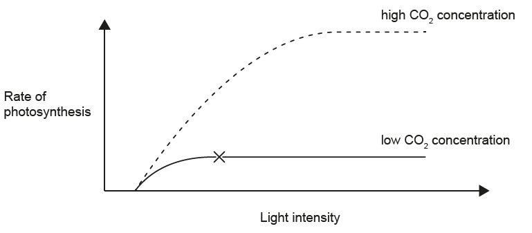 At low \( \mathrm{CO_2} \) concentration, the curve quickly reaches a plateau even as light intensity increases. A plateau means that raising light no longer increases the rate, so light is not limiting at \(x\). Temperature is fixed at \(25^{\circ}\mathrm{C}\) and chlorophyll content is not the changing variable here. Therefore, the factor restricting the rate at \(x\) is the availability of \( \mathrm{CO_2} \).