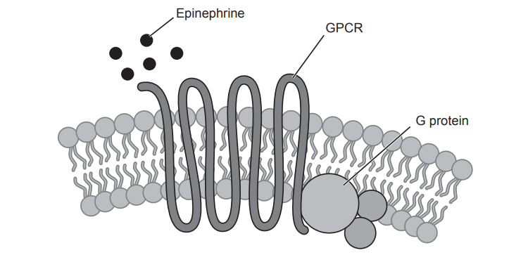 Epinephrine binds to its G protein–coupled receptor (GPCR) on the cell membrane. This binding activates the attached G protein, which then stimulates a series of intracellular reactions. One major effect is the production of cyclic AMP (cAMP), a second messenger that triggers specific cellular responses, depending on the cell type involved.