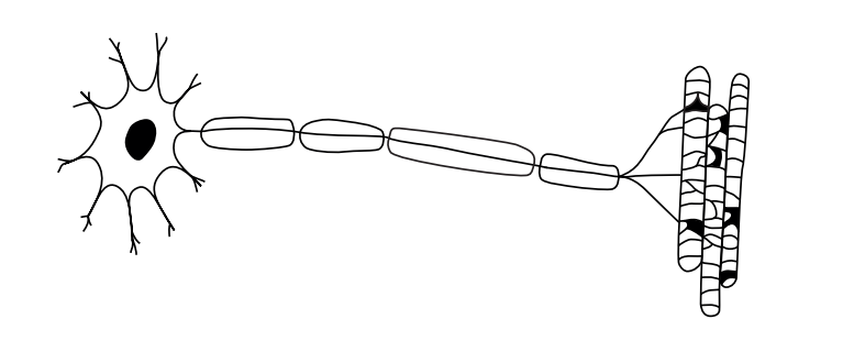 Neurons are highly specialized cells with structures that support their role in transmitting signals. The diagram below shows a neuron forming a connection with a muscle cell.