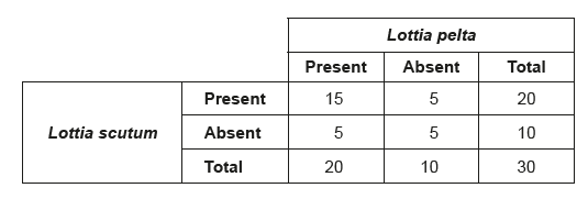 - You are testing whether the presence of Lottia scutum is independent of the presence of Lottia pelta.