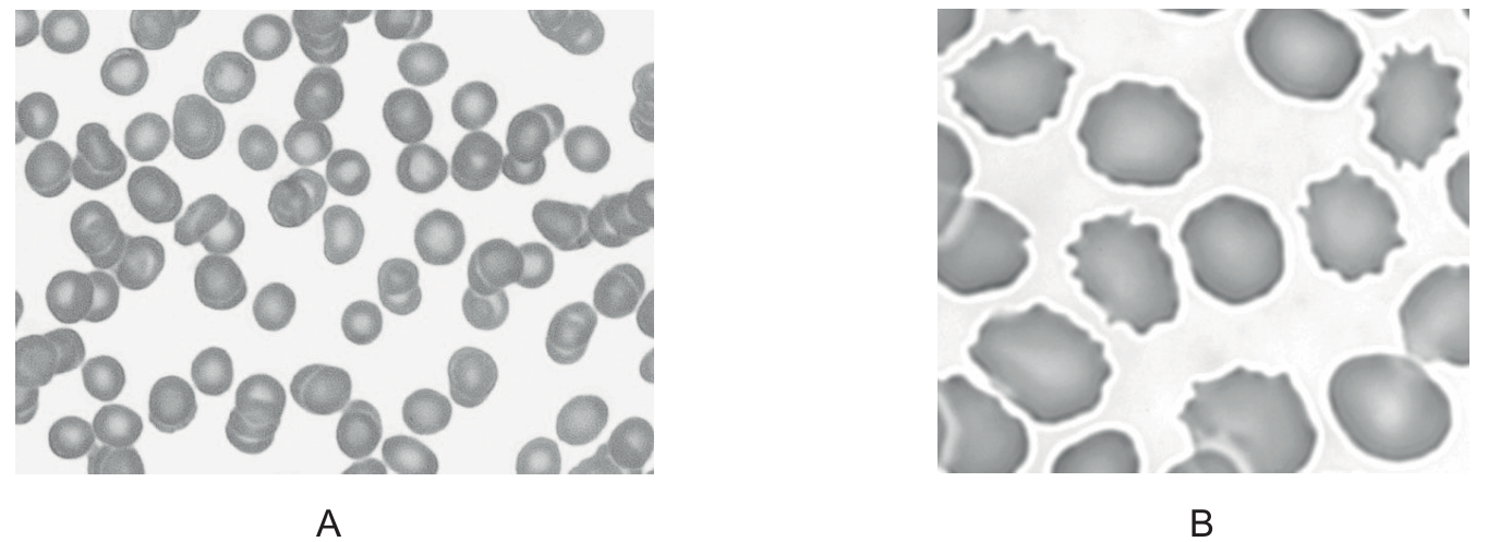 • In micrograph B, red blood cells appear shrivelled compared with those in A.
