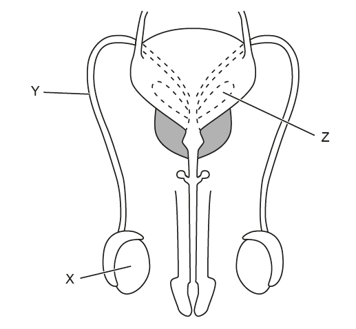 Label X points to the testis, which produces sperm. Label Y indicates the sperm duct (vas deferens), which transports sperm toward the urethra. Label Z corresponds to the seminal vesicle, a gland that contributes fluid to semen. ✅ Answer: (A)