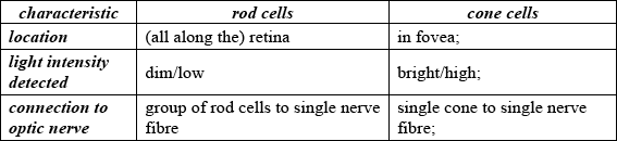 rod cells are all the same/black and white vision but there are three types of cone cells (absorb red, blue and green colour)/colour vision;