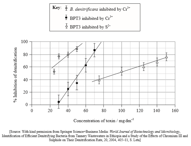 a. Cr3+ more toxic than S2– (between concentrations of about 67/70 and 80 mgdm–3);