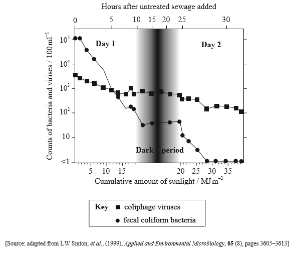 Release of sewage in marine waters is a common practice but it can cause water contamination with pathogens. A series of experiments were conducted to compare inactivation rates of two different groups of microbes with different sunlight exposures. One group were fecal coliform bacteria and the other were coliphage viruses. Experiments were conducted outdoors using 300-litre mixtures of sewage-seawater in open-top tanks.