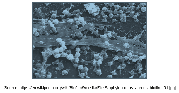 The micrograph below shows an example of a biofilm including Staphylococcus aureus.