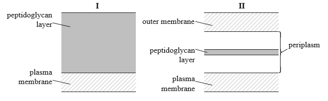 The diagram below represents the cell walls of two different bacteria. State, with a reason, which cell wall (I or II) is Gram-positive.