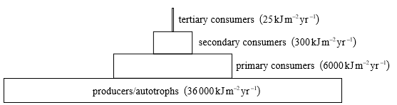 Research into a river ecosystem produced these approximate values: 25, 300, 6000 and 36 000 kJ m–2 yr–1. Using this data, construct a pyramid of energy showing four named trophic levels, each with their corresponding energy value.