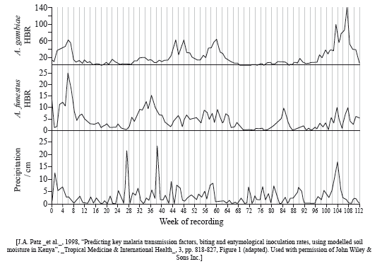 Many factors affect the distribution of animal species including weather patterns. The mosquito Anopheles is a carrier of malaria, a disease that kills one to two million people annually. The eggs of the mosquito are laid in water and they hatch out as larvae before turning into adult mosquitoes. A study was undertaken to look at the influence of weather patterns on the incidence of bites on children. Being bitten increases the risk of catching malaria.