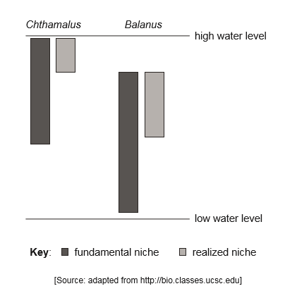 Chthamalus and Balanus are two species of barnacles that live attached to rocks between the low and high tide level of the sea. The distribution of each species is influenced by the presence of their own species and different species.