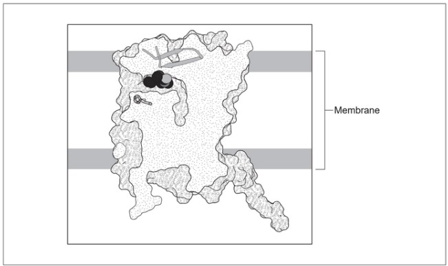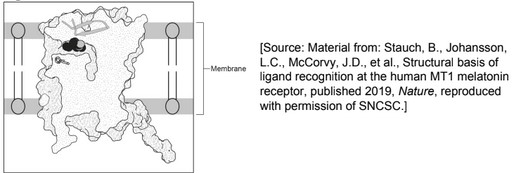 The diagram shows a section through the melatonin receptor, with melatonin attached to its binding site. Darker grey areas show the surface of the protein and paler areas are internal. The membrane in which this receptor is located is also shown.