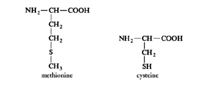 Proteins can contain Sulphur for example, Methionine and Cysteine are the two sulfur-containing amino acids that are incorporated into proteins. Sulfur belongs to the same group in the periodic table as oxygen but is much less electronegative. This difference accounts for some of the distinctive properties of the sulfur-containing amino acids.