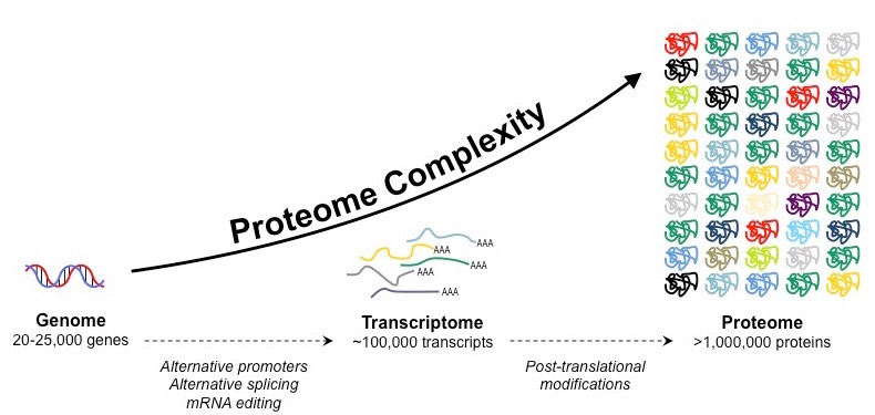 The size of the proteome depends on the organism, cell type, and environmental conditions. It is estimated that the human genome contains about 20 000 protein-coding genes, but each gene can produce multiple protein variants by alternative splicing, post-translational modifications, and proteolytic cleavage. Therefore, the human proteome is much larger than the human genome. A proteome is the complete set of proteins expressed by an organism, while a mRNA is specific short chain of amino acids which is much shorter than a proteome.