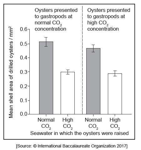 Using all the data, evaluate how $CO_2$ concentrations affect the development of oysters and their predation by gastropods.[2]
