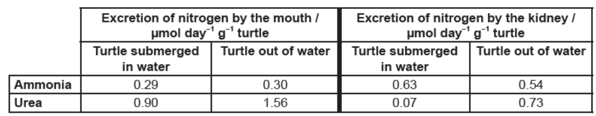a.Deduce whether the excretion of ammonia or urea changes more when a turtle emerges from water.[2]
