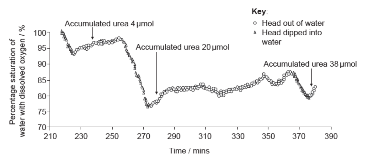 a. oxygen absorbed from water/exchanged for urea when head dipped in water«so oxygen concentration decreases»