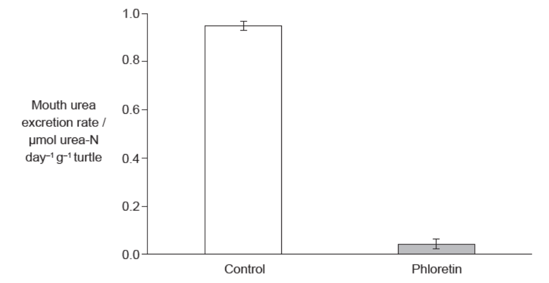 In order to test whether a urea transporter was present in the mouth tissues of the turtles, phloretin (a known inhibitor of membrane proteins that transport urea) was added to the water in which a further set of turtles submerged their heads. The results of that treatment are shown.