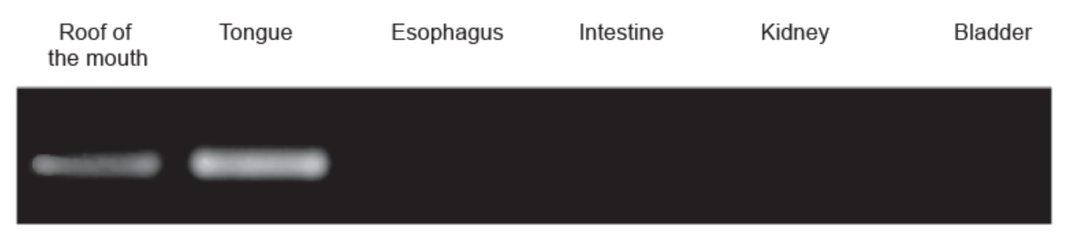 a. mRNA only in mouth and tongue/in mouth and tongue but not esophagus intestine kidney or bladder