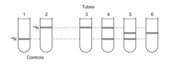 Which centrifuge tube shows the arrangement of bands observed after one round of replication?