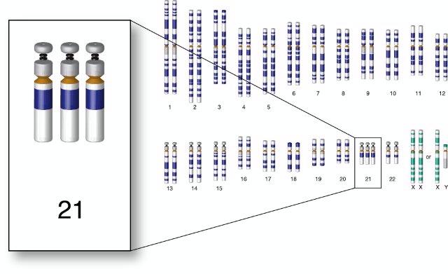 This can happen when there is an error in cell division called nondisjunction. Nondisjunction means that the chromosomes do not separate properly during meiosis, the process that produces eggs and sperm. If an egg or a sperm has an extra chromosome 21 and joins with a normal egg or sperm during fertilization, the resulting embryo will have three copies of chromosome 21 instead of the usual two. This is called trisomy 21 and it accounts for about 95% of Down syndrome cases¹. Sometimes, only part of chromosome 21 is extra, or the extra chromosome 21 is attached to another chromosome. These are called translocation and mosaic Down syndrome, respectively, and they are less common. The risk of nondisjunction increases with maternal age, especially after age 35. Altered recombination, which means that the exchange of genetic material between chromosomes during meiosis is abnormal, may also increase the risk of nondisjunction.