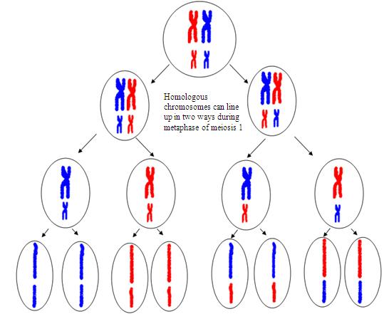 During meiosis, the pairs of homologous chromosome are divided in half to form haploid cells, and this separation, of homologous chromosomes is random. This means that all of the maternal chromosomes will not be separated into one cell, while the all paternal chromosomes are separated into another.