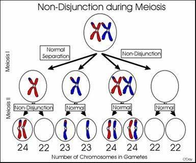 The haploid number for humans is 23, so normally a human gamete would have 23 chromosomes. However, sometimes there is a failure of chromosomes or chromatids to separate properly during cell division, which is called nondisjunction. This can result in gametes with an abnormal number of chromosomes, which is known as aneuploidy. For example, if nondisjunction occurs during meiosis I or meiosis II, a human gamete could end up with 24 or 22 chromosomes instead of 23. This can cause genetic disorders such as Down syndrome (trisomy 21) or Turner syndrome (monosomy X). Therefore, the chromosome number 24 in human gamete is with nondisjunction.