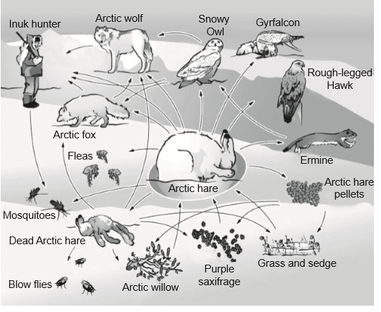 Hare, Arctic hare is feeding mainly on producers (grass, purple saxifrage and arctic willow) & fulfilling most the qualities of primary consumer of given food web.