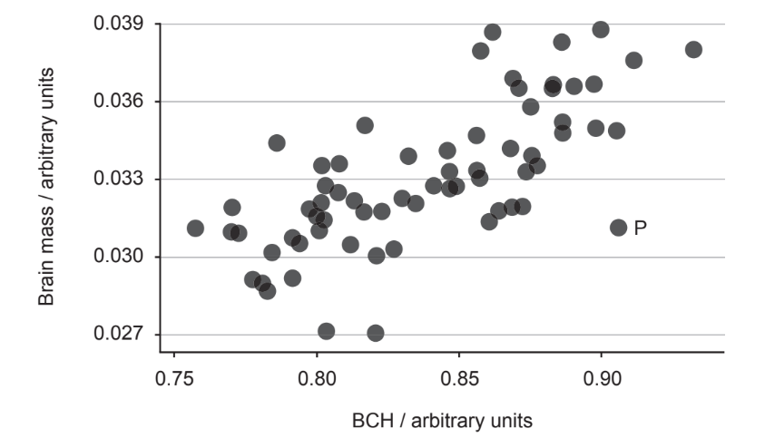 b. (fairly) low brain mass but BCH is high/higher than expected/higher than others with similar brain mass;