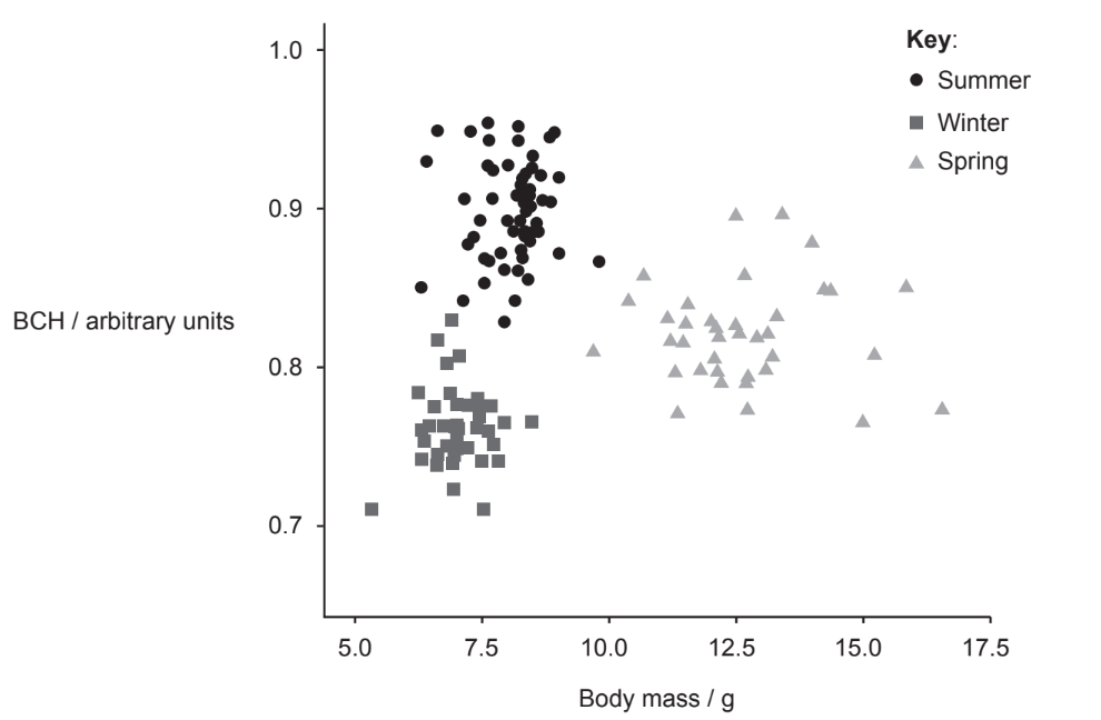 The researchers found that the BCH of any individual adult shrew could vary seasonally. They collected shrews at different times of the year. The BCH of each shrew was compared with its body mass. The results are displayed in the chart.