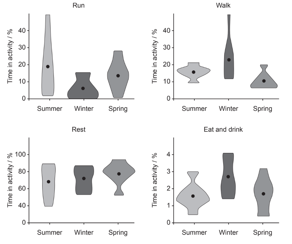 Shrews were observed in different seasons and the time they spent on a particular activity was recorded and expressed as a percentage of the total observation time. The circles in the kite shapes represent the mean value of time for each activity.