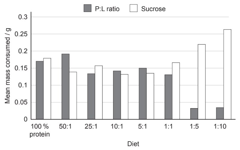 Destruction of preferred habitats has affected the size of bumblebee populations and for survival, bumblebees have to feed on pollen from other available plant habitats. To simulate different pollens, researchers fed bumblebees on eight diets consisting of a mixture of proteins and lipids in different ratios $(P: L)$. The bumblebees also had access to sucrose. There was no restriction on the amount of each food the bumblebees could consume. The chart shows the mean daily mass of food eaten for eight diets with different $P: L$ ratios.