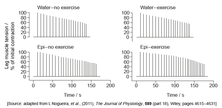 A group of adult mice was used to measure the effects of a low dose of Epi given over 15 days. The mice were divided into four groups and given either water or Epi and were either kept idle (no exercise) or made to exercise on a treadmill.