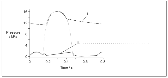 Identify the two parts of the circulatory system that produce traces I and II on the graph. [2]